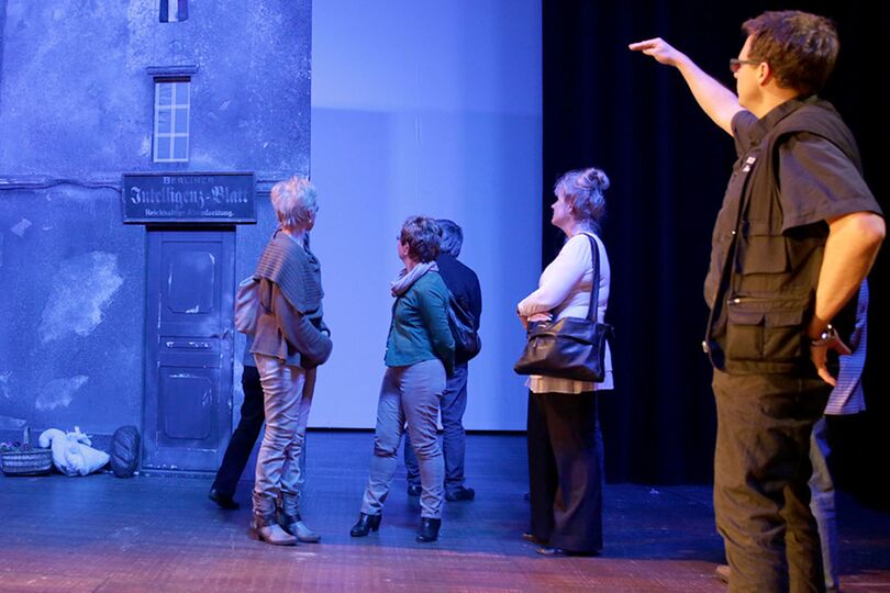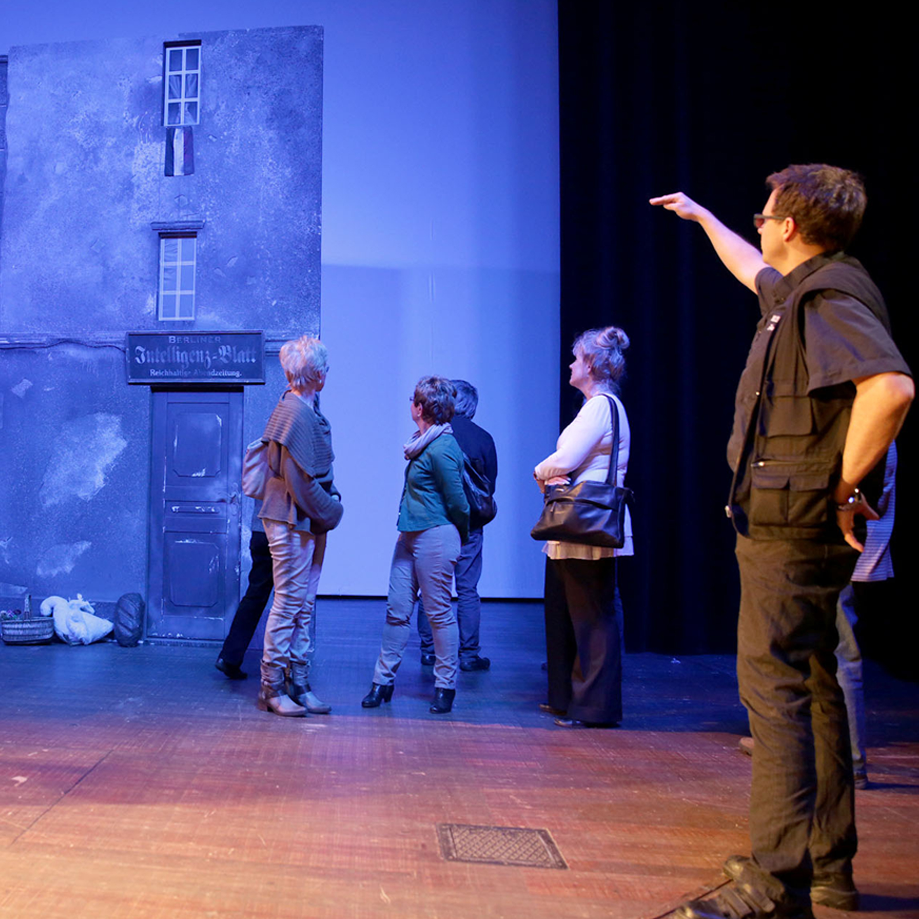 „Weil wir gerade unterbrochen haben“ - dieser Satz fällt quasi bei jeder Probe und ist ein willkommener Anlass, nicht nur die moderne Theatertechnik und die Bühne vorzustellen, sondern auch ein wenig abzuschweifen und zahlreiche Anekdoten aus dem Leben im Brandenburger Theater zu erzählen.