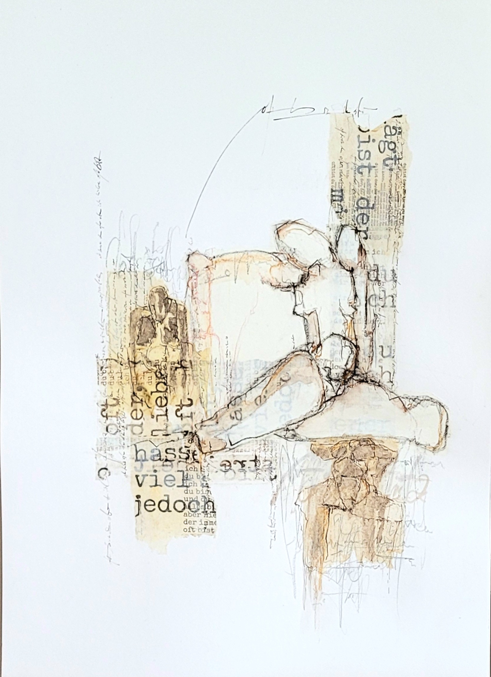 In ihrer Ausstellung zeigt Bettina Engel Arbeiten, die von literarischen Texten inspiriert sind. Sie schafft Grafiken, die Bilder mit Schriftfragmenten verbinden. Diese Arbeiten bilden die Grundlage für die Serie „Transkription“, in der sie sich besonders an lyrische Texte von Thomas Brasch herantastet, der in diesem Jahr 80 Jahre alt geworden wäre.
