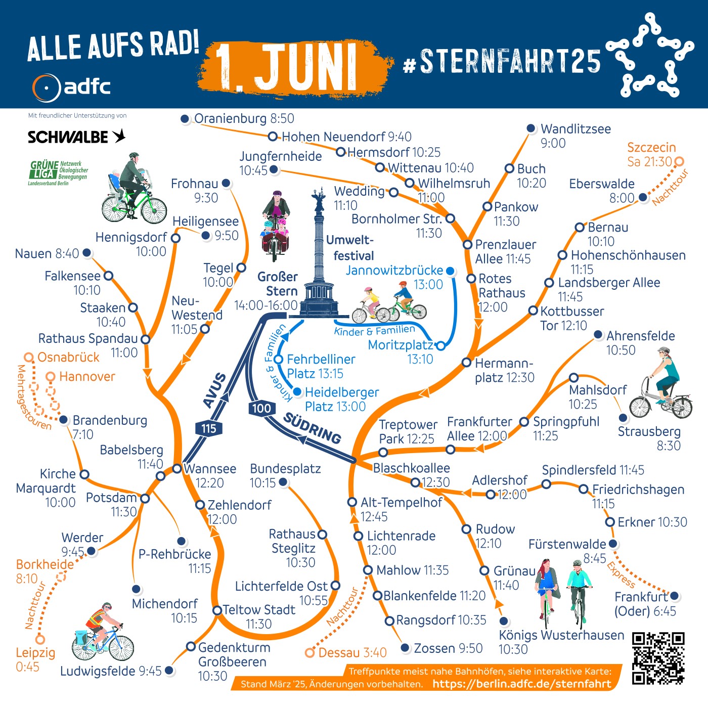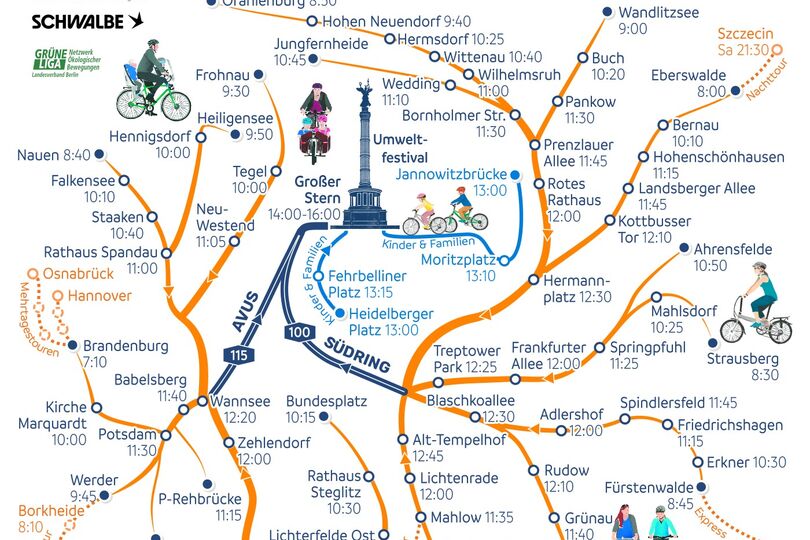 und dort dann in die Sternfahrt einsteigen. Für Familien mit kleinen Kindern gibt es 2 geeignete Routen. Die 1. Familienroute startet um 13:00 Uhr nah am S-Bahnhof Jannowitzbrücke und die 2. Route am Heidelberger Platz unweit des gleichnamigen S + U-Bahnhofs ebenfalls um 13:00 Uhr. Das gemeinsame Ziel aller 20 Routen inklusive der Nachttouren aus Stettin, Leipzig und Dessau sowie der beiden Mehrtagestouren aus Hannover und Melle ist das Umweltfestival zwischen dem Großen Stern und dem Brandenburger Tor.