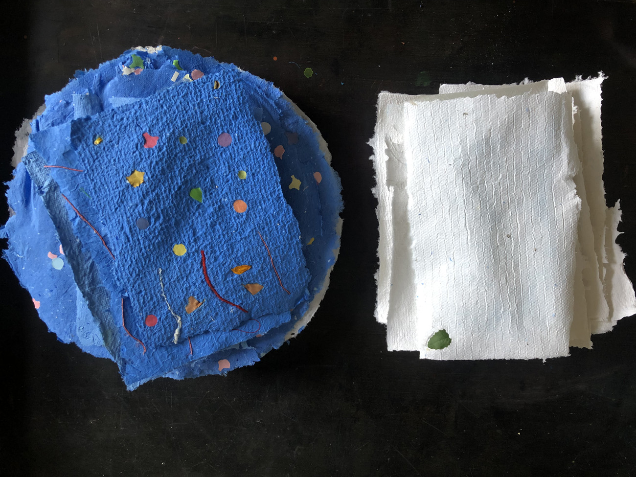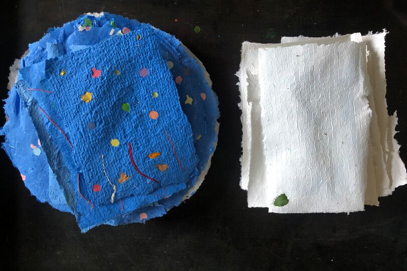 Wir arbeiten mit Papierpulpe und schöpfen selbst Papiere, die wir mit verschiedenen Möglichkeiten gestalten, es können Blüten und Farbpulver eingestreut, Fäden eingebaut werden. Sicher habt Ihr dazu auch eigene Ideen, wenn Ihr beim Arbeiten seid. Am besten, Ihr kommt an zwei Tagen, damit die Papiere für eine Weiterarbeit trocknen können.