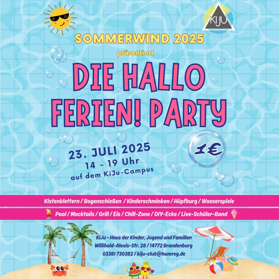 Völlig losgelöst … nur noch ein paar Tage aushalten! Dann beginnen sie endlich: die ""SOMMERWIND ‘25" Ferien auf dem KiJu-Campus. Wie immer werden sie mit der HALLO FERIEN! - Party feierlich eröffnet. Los geht’s am 23. Juli von 14 bis 19 Uhr. Mit dabei sind diesmal Bogenschießen, der höchste Kistenkletterturm des Havellandes, die Hüpfburg, die DIY-Ecke, Kinderschminken und vieles, vieles mehr. Außerdem erfahrt ihr, was an jedem einzelnen Ferientag im KiJu los ist und wie ihr einen Platz auf dem Kinder- und Jugendfloß „Beetzy“ oder die Reise zu Käpt’n Brass entern könnt. Den ganzen Nachmittag über wird gegrillt. Mocktails, Limo, Eis und Brause gibt es natürlich auch vor unserm Hause.