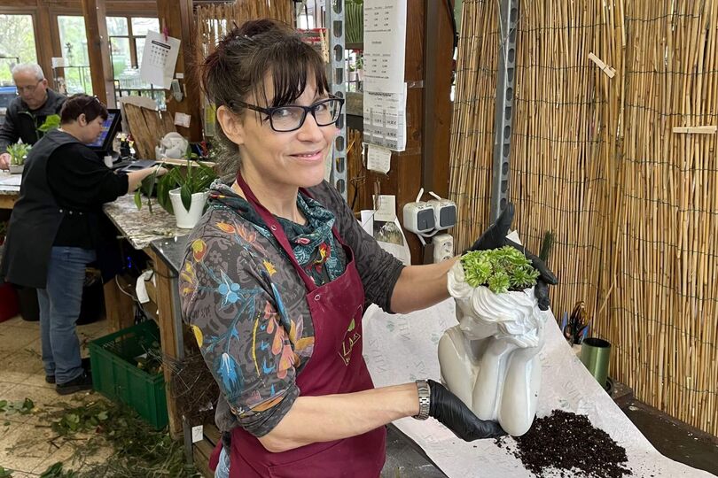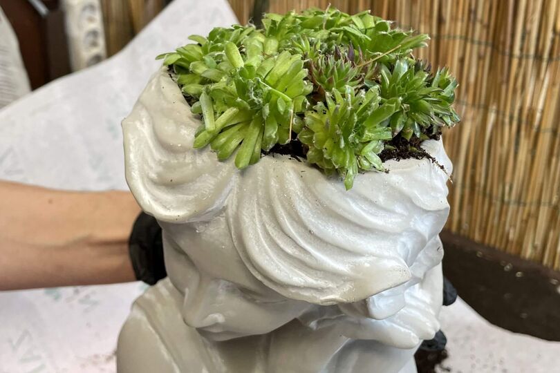 Zur Zierde pflanzt Floristin Doreen Bölker-Jaschob etwas Donnerkraut in eine Frauenbüste. Die Holde kann man sich als Abbildung der märchenhaften Undine vorstellen. „Das passt ja“, sagt die Floristin, „neben unserem Roland ist ja das Café Undine“.