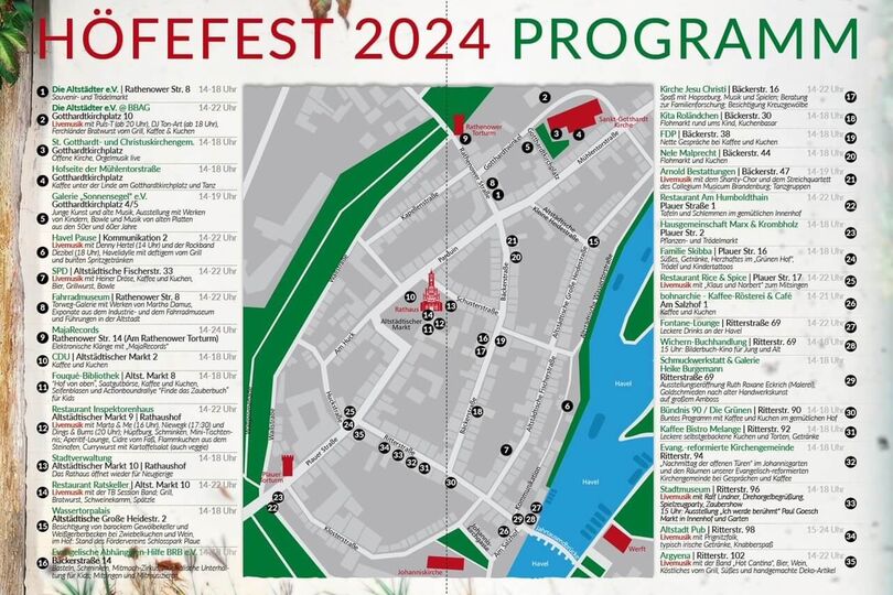 Das reicht von Kaffee und Kuchen über Puppenspiel, Hüpfburgen, Kleinkunst und Gesang bis hin zu Tanzdarbietungen. Mehr als 20 Teilnehmende haben gastronomische Angebote und bei mehr als 15 geöffneten Höfen gibt es Live-Musik. Die Höfe haben zwischen 14:00 und 18:00 Uhr geöffnet, einige aber auch bis in die späteren Abendstunden.