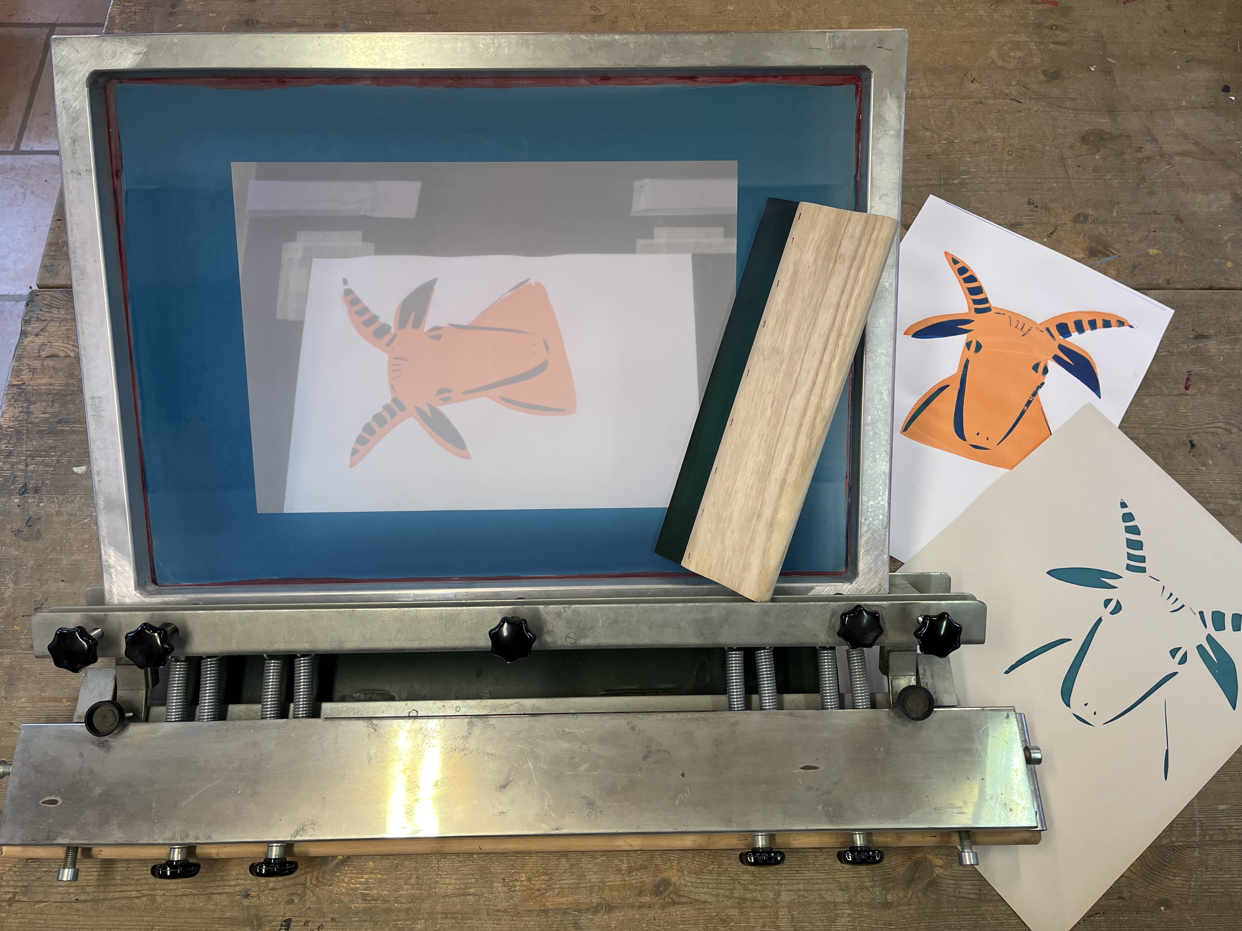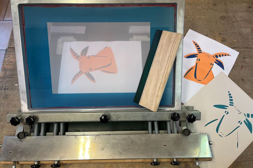 Mithilfe einer selbst angefertigten Schablone stellen wir unseren eigenen Siebdruck her. Eventuell auch mehrfarbig.