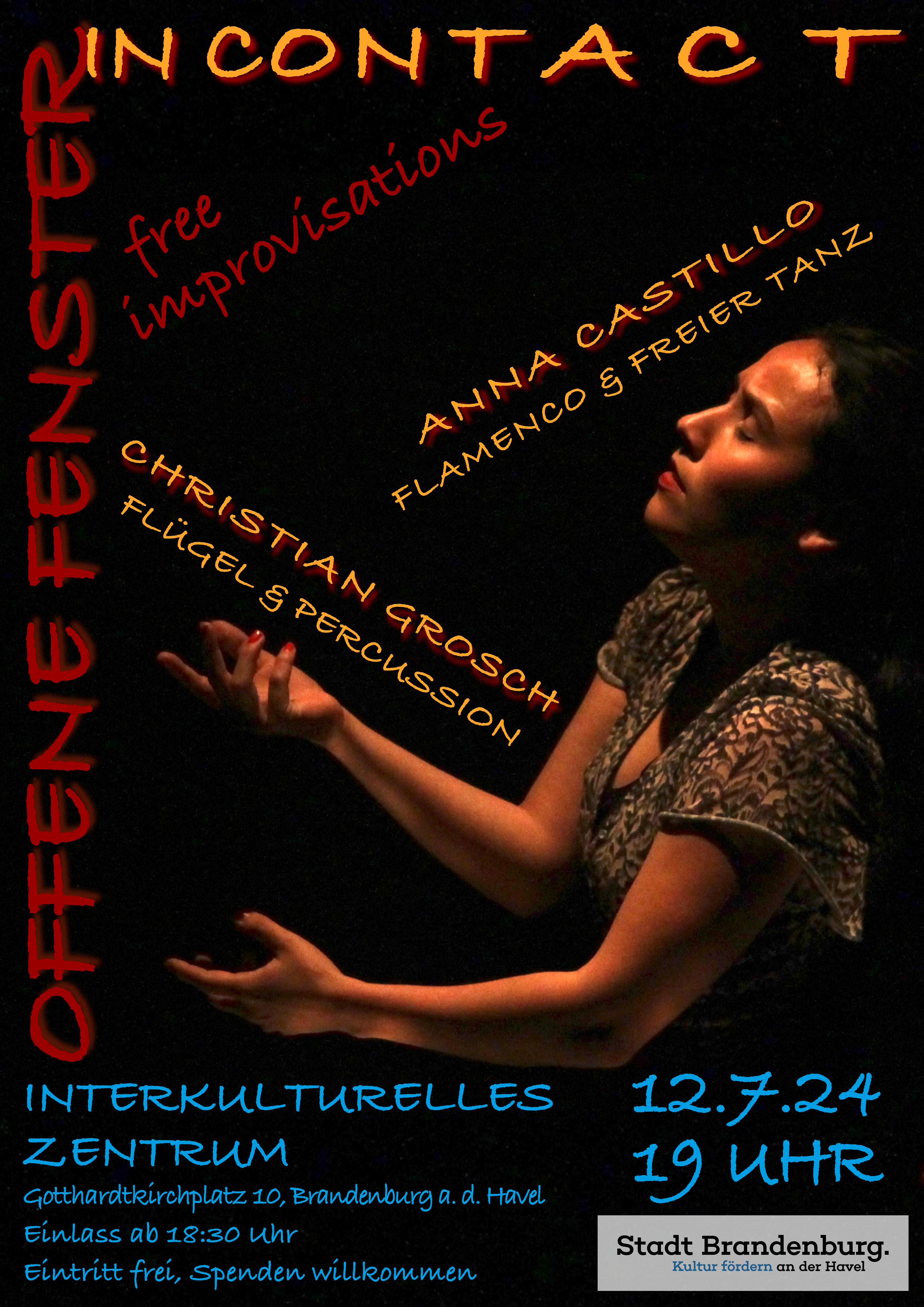 Der Brandenburger Jazzpianist Christian Grosch gestaltet in der Reihe "Offene Fenster" regelmäßig Konzerte in der Altstadt. Sie bestehen aus freien Improvisationen – offen in alle musikalischen Himmelsrichtungen. In regelmäßigen Abständen lädt Grosch Gastkünstler:innen zu gemeinsamen Duokonzerten ein. Am Freitag, 12. Juli, 19 Uhr, wird nun erstmals eine Improvisations- und Flamenco-Tänzerin die Offenen Fenster bereichern. Anna Castillo wird dabei mit traditionellen Flamenco-Steppschuhen tanzen und so auch ganz eigene klangliche Impulse in die neu entstehende Musik einbringen.
