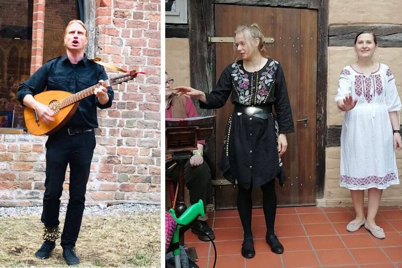 Mathias Kriesel begleitet den Nachmittag musikalisch. Er singt Brandenburger Sagen und spielt auf Nasenflöte und Laute.