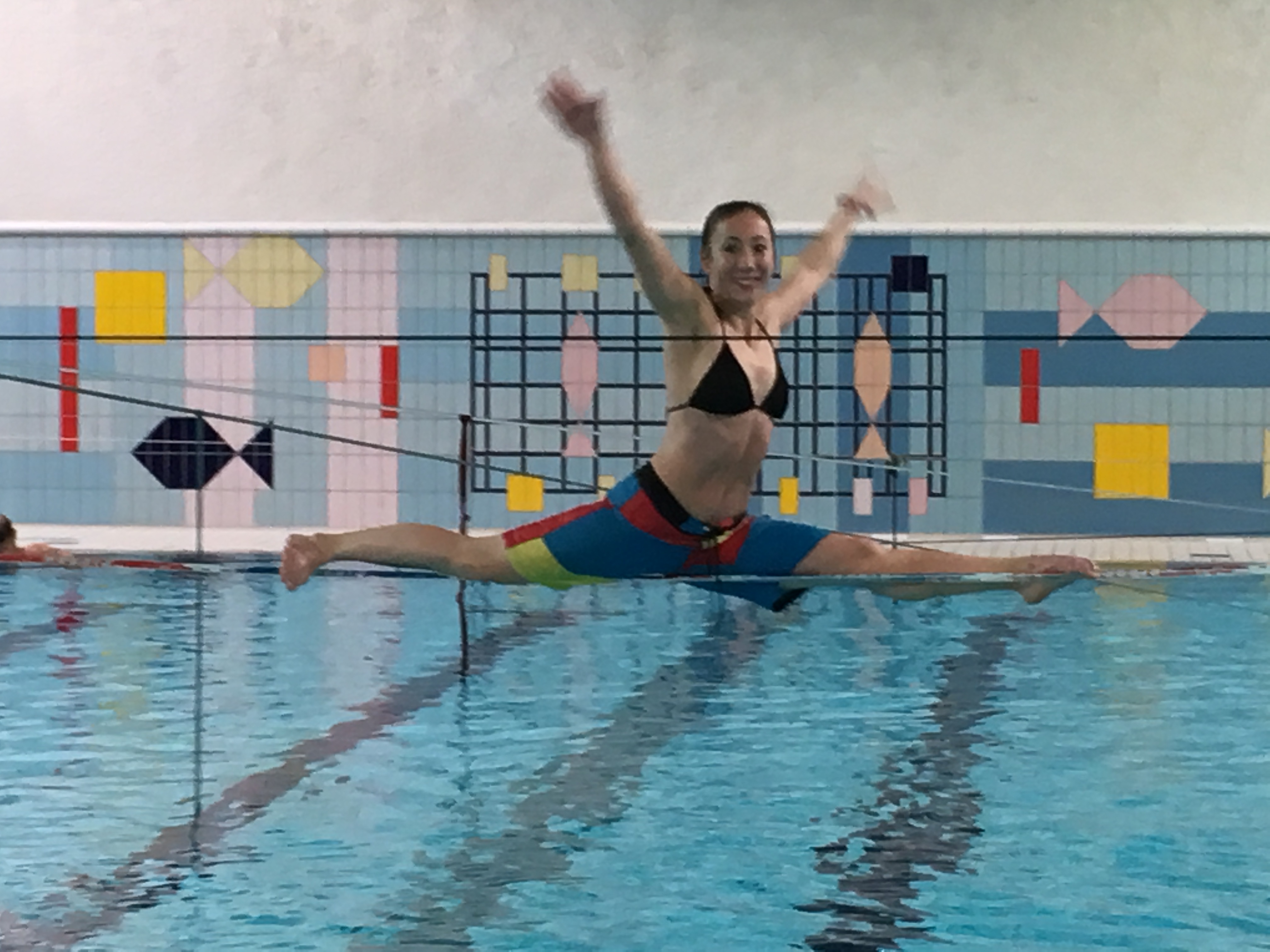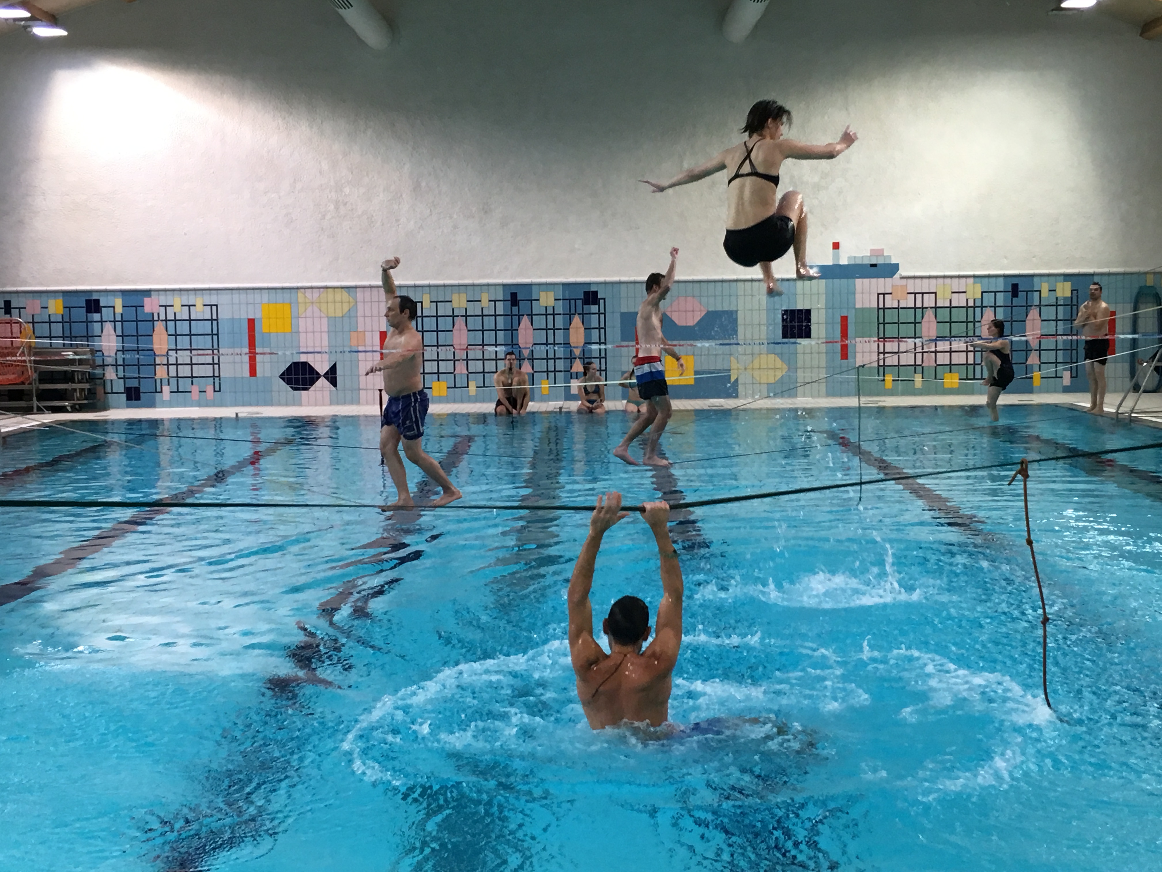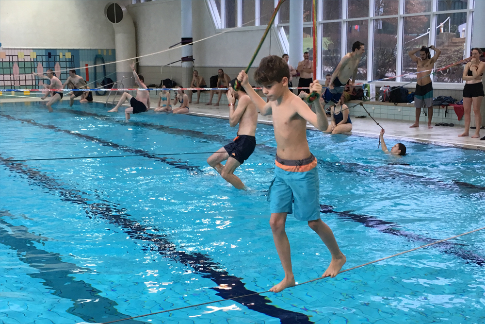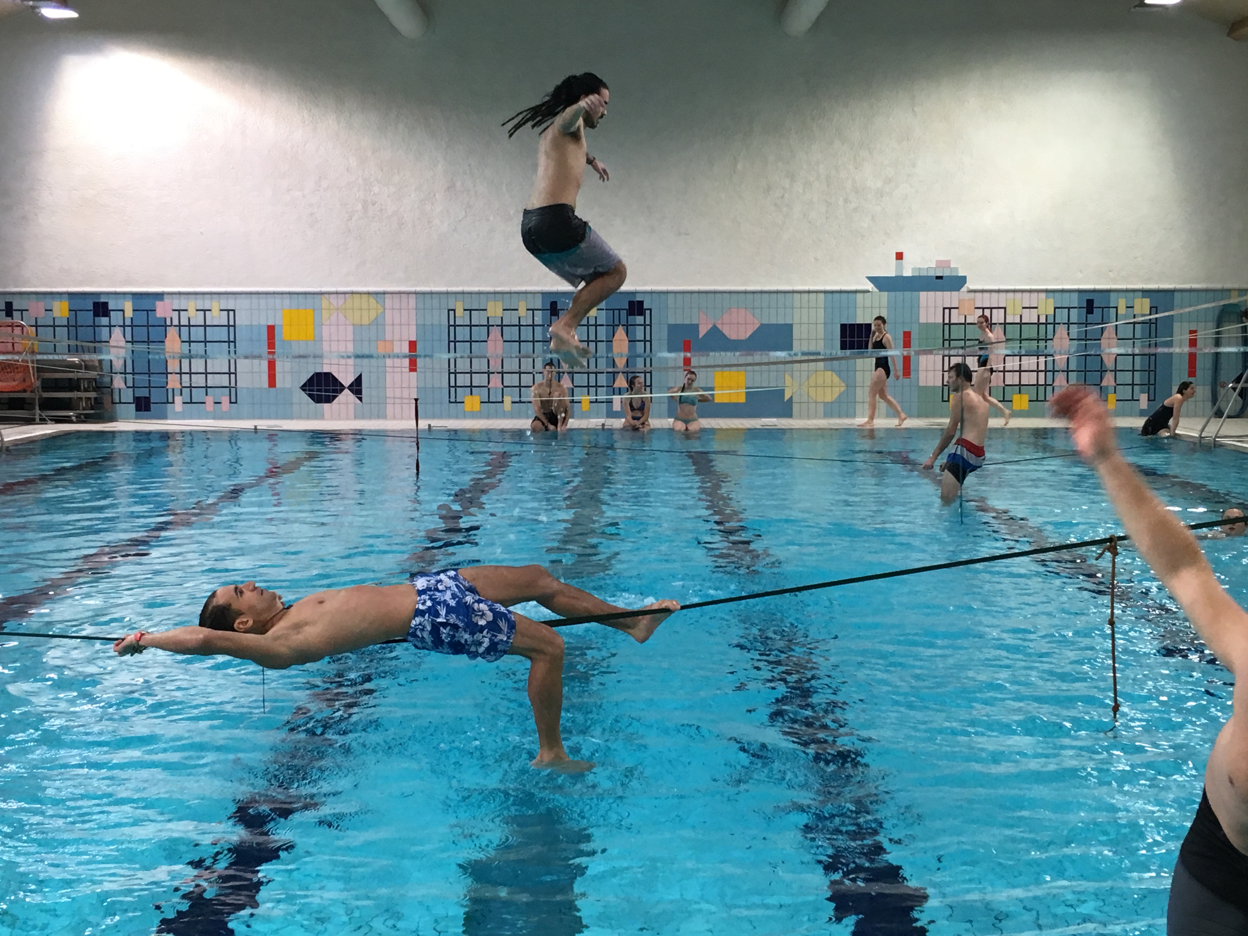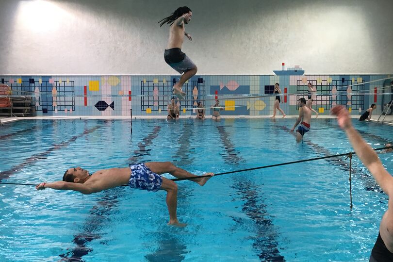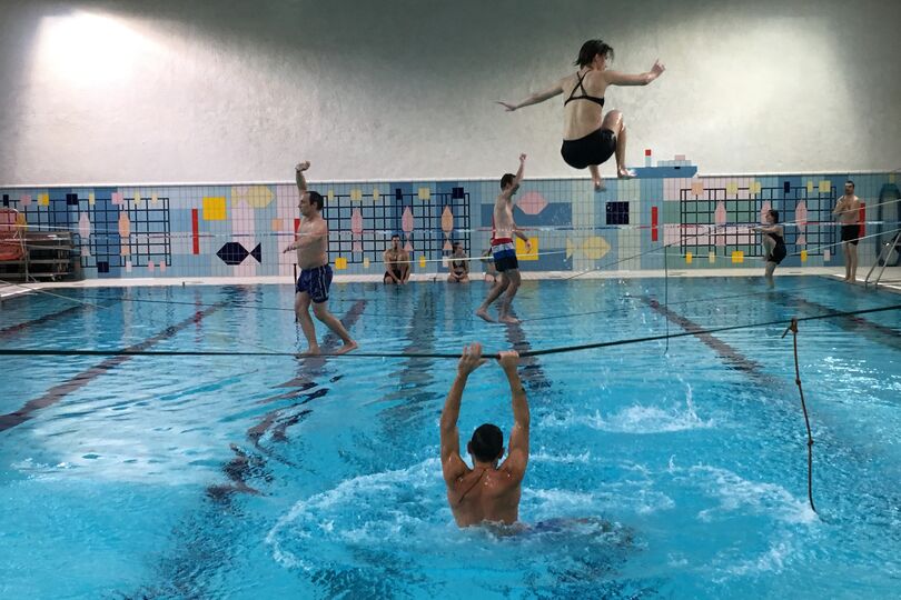 Heute wird das Marienbad wieder zu einem Slackline-Hotspot und die Leinen werden über das Wasser im 25-Meter-Becken gespannt.