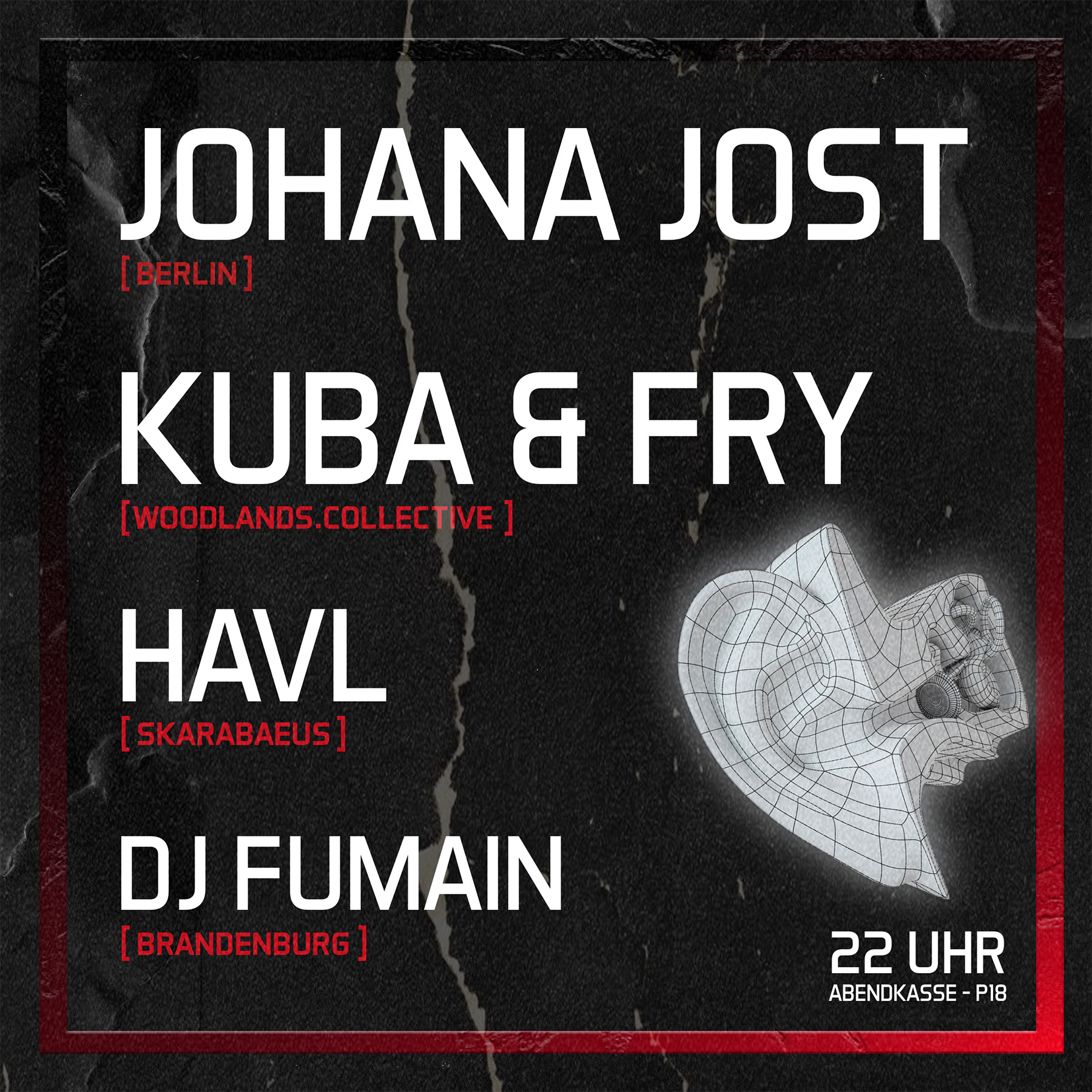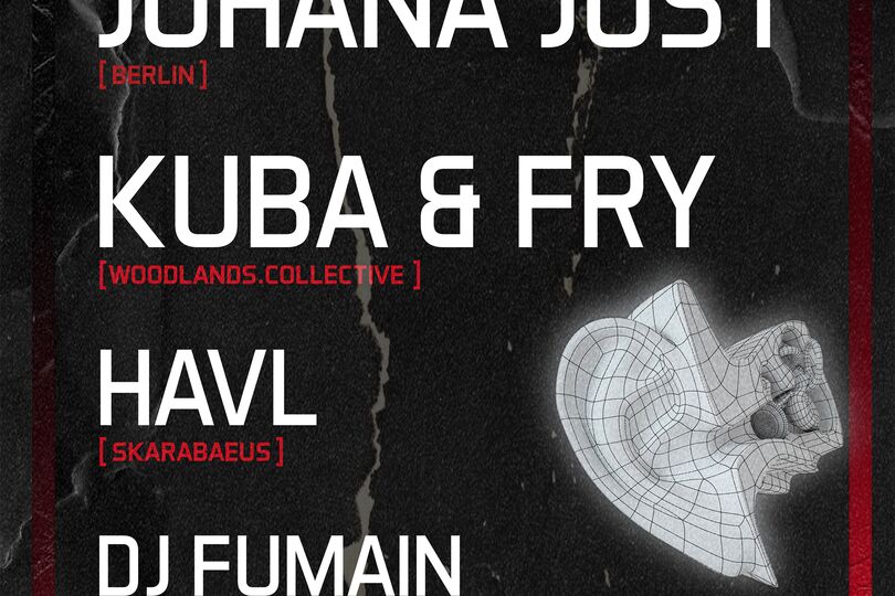 Freut euch außerdem auf HAVL, Brandenburger Urgestein der Technoszene und Mitglied des Skarabaeus Kollektiv sowie auf DJ Fumain.