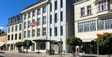 Anfahrt: Mit der Straßenbahnlinie 1 oder 6 an der Haltestelle "Hauptstraße" aussteigen – In der Hauptstr. 33-35 befindet sich der Konferenzraum im 4. Geschoss der Geschwister Pape GmbH. Der Eingang erfolgt über die Petersilienstraße.