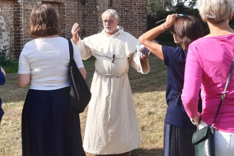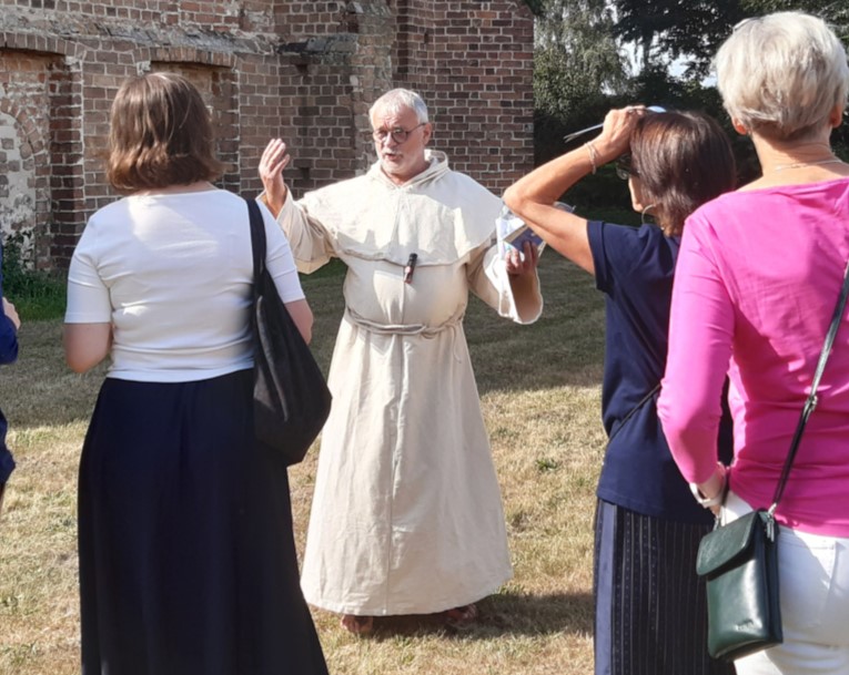 Das diesjährige Motto lautet „Wahr-Zeichen. Zeitzeugen der Geschichte“. Das ist auch das Thema der sehr unterhaltsamen Führungen, die von Vereinsmitgliedern des Fördervereins Wallfahrtskiche zu Buckow angeboten werden. Michael Duhr in dem Outfit eines Prämonstratenser Abtes zeigt, wie einst die Bauherren vom Dom zu Brandenburg ausgesehen haben. Er und Henry Kilian (in Zunftkleidung) erklären bei einem Rundgang um die Kirche sehr anschaulich, warum dieser kolossale Bau in so einem kleinen Dorf wie Buckow bei Nennhausen ein ganz besonderes Wahr-Zeichen im Westhavelland ist.